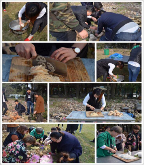 食材準備結(jié)束后,大家分頭開始大干一場,味蕾隨著這場美食大戰(zhàn)也不安分地躁動起來。不一會兒,山坳里就飄起了裊裊的炊煙。這種原生態(tài)的生活方式將平日里的廚房搬到了山間,別有一番樂趣。那熊熊火焰舔嗜著鍋底,花生油在“吱吱”的響著,讓人垂涎欲滴。,男同志幫忙生火起灶,而女職工則大展廚藝,經(jīng)過緊張有序的忙碌,一道道色、香、味俱全的菜品呈現(xiàn)在大家面前